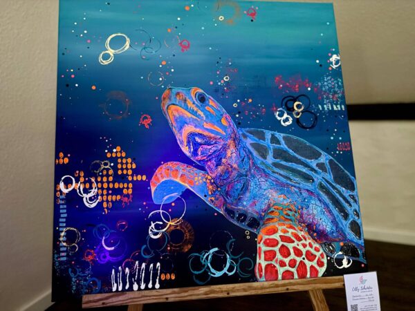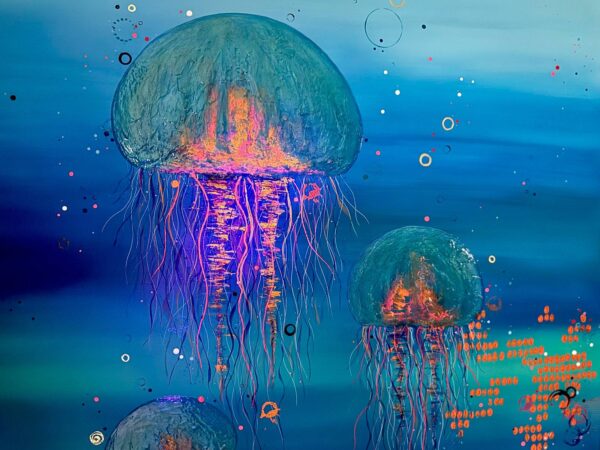 Schröders Arbeiten spielen mit dem Zusammenspiel aus Farbe, Struktur und Transparenz. Mal scheinen Wellenbewegungen über die Leinwand zu gleiten, mal brechen Lichtstrahlen durch schwebende Formen – fast so, als würde man selbst unter der Wasseroberfläche treiben.