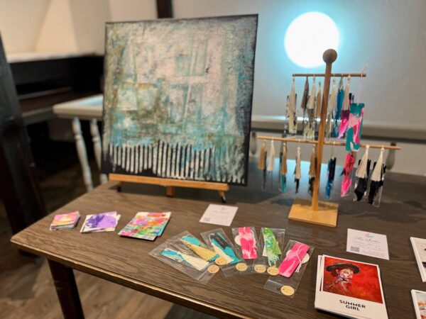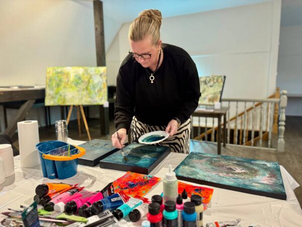 Ihre Werke entstehen aus einer Mischung aus Acryl, Harz und Naturmaterialien. Die Transparenz dieser Techniken lässt Tiefe entstehen – und zugleich Raum für eigene Interpretationen.