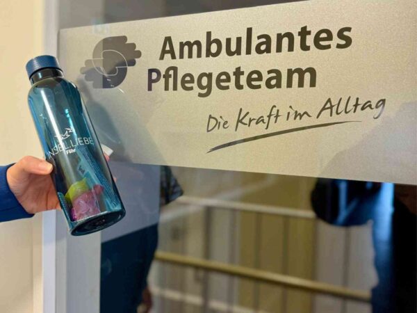 Als wir plötzlich vor der Tür standen, war die Überraschung groß. Levke Quedens und Marco Hägermann vom Ambulanten Pflegeteam rechneten mit allem – aber ganz sicher nicht mit dieser Aktion. Die Freude war ihnen sofort anzusehen. Mitgebracht hatten wir 14 Trinkflaschen, liebevoll gefüllt mit kleinen Leckereien: Müsliriegel, Nervennahrung, praktische Kleinigkeiten – gedacht für lange Tage im Auto, spontane Einsätze und kurze Pausen zwischen Terminen.
