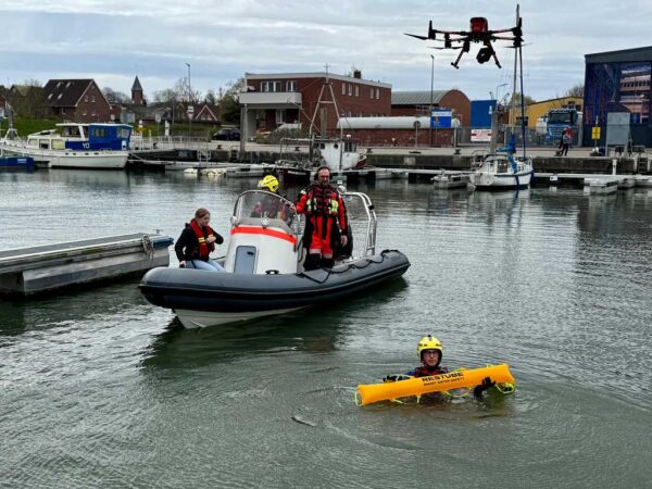 Der entscheidende Moment: Die Drohne steht nahezu bewegungslos über dem Hafenbecken. Darunter ein junger Mann im Neoprenanzug – das „Seenotopfer“. Ein Klick, das Paket löst sich, fällt ins Wasser – nur wenige Meter neben ihm. Sekunden später bläst sich die Boje automatisch auf.