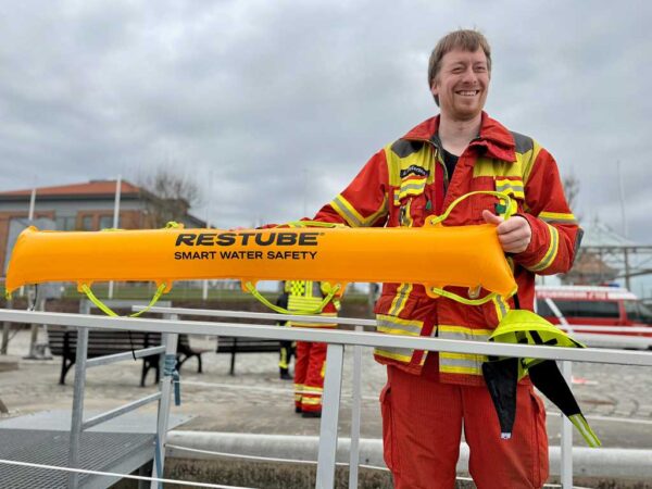 Im Mittelpunkt der Übung stand ein neues System: ein sogenanntes „Restube 180 Automatic“. Eine selbstaufblasbare Schwimmboje, die im Notfall per Drohne über einer Person im Wasser abgeworfen wird.