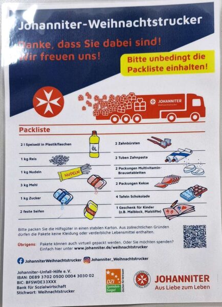 Die diesjährige Packliste enthält ein paar Grundnahrungsmittel wie Mehl, Zucker, Nudeln oder Öl, Kekse, Schokolade, einige Drogerieartikel und ein kleines Kindergeschenk und ist genau einzuhalten (s. Anlagen). Damit soll zum einen für Gerechtigkeit in den Empfängerländern gesorgt werden, zum anderen müssen auch die Richtlinien des Zolls eingehalten werden.