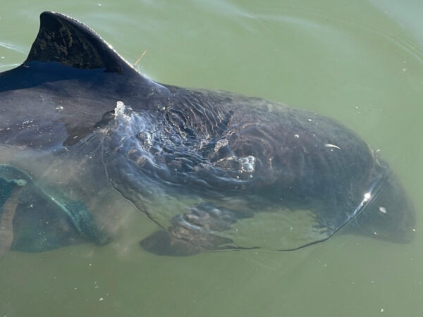 Anschließend wurde der Schweinswal geborgen und so schnell wie möglich an eine Stelle mit ausreichend Wasser gebracht. Offenbar war das Tier zuvor durch die Tide in der Bucht eingeschlossen worden und hatte es nicht mehr rechtzeitig zurück ins tiefere Wasser geschafft. Zum Glück lag es noch in einer kleinen Mulde mit etwas Restwasser – ein entscheidender Faktor für sein Überleben. Bis auf kleinere Hautschrammen wirkte der Wal stabil.