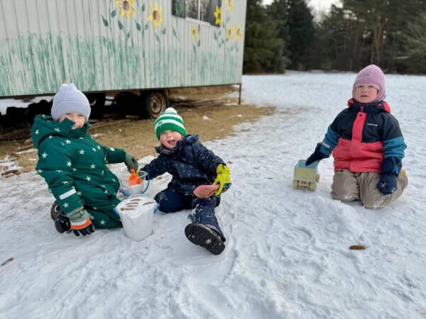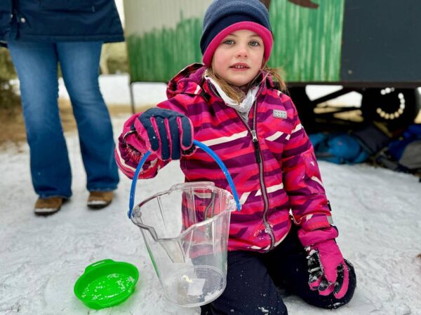 Schon kurze Zeit nach der Übergabe ist die Überraschung Teil des Alltags geworden. Die Kinder bauen Schneeburgen, füllen Eimer mit Schnee und probieren die neuen Fahrzeuge direkt aus.