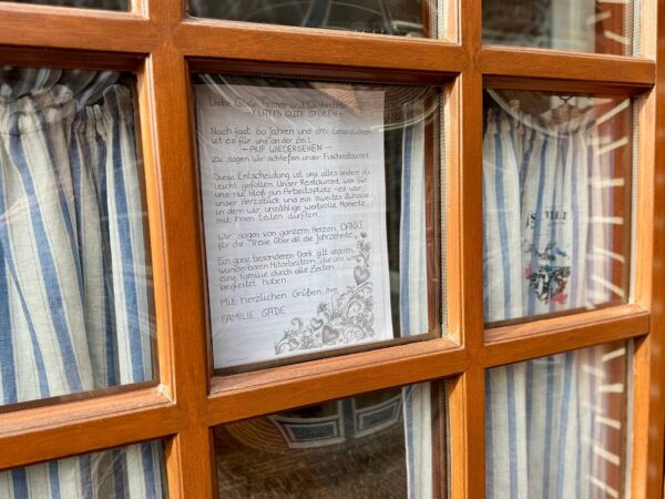 Die nächste schlechte Nachricht für die Gastronomie auf Föhr! Klatt’s Gute Stuben und Klatt’s Fischladen gegenüber vom Edeka Knudsen Markt in Wyk sind ab sofort geschlossen. Nach fast 60 Jahren und drei Generationen endet damit ein weiteres Kapitel Föhrer Gastro-Geschichte. In den Fenstern der beiden Betriebe hängen handgeschriebene Abschiedsbriefe der Familie Gade – persönlich, bewegend und voller Dankbarkeit.