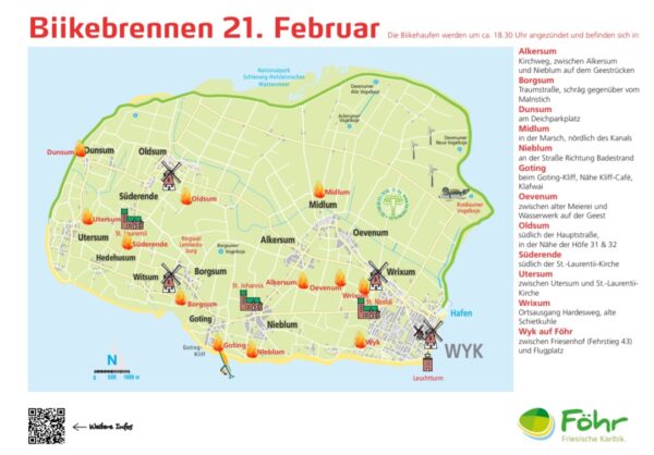 Pünktlich um 18:30 Uhr lodern auf ganz Föhr die Flammen in den Abendhimmel: Zwölf Biikehaufen werden gleichzeitig entzündet – ein beeindruckendes Zeichen gelebter Tradition und nordfriesischer Gemeinschaft. Mit dem Biikebrennen verabschiedet sich die Insel einmal mehr von der dunklen Jahreszeit und heißt den nahenden Frühling willkommen.