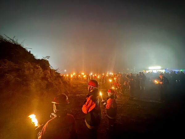 Es wurde langsam immer später – und der Matsch an den Füßen nicht weniger. Trotzdem durfte ein kurzer Halt an der letzten Station des Abends nicht fehlen: das Biikefeuer in Oevenum.