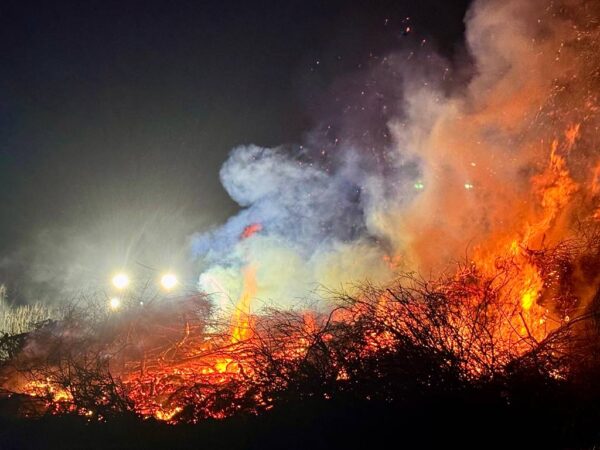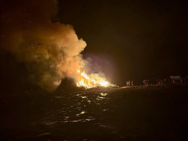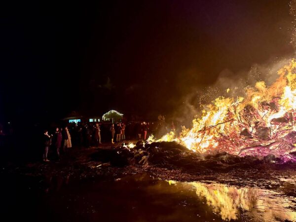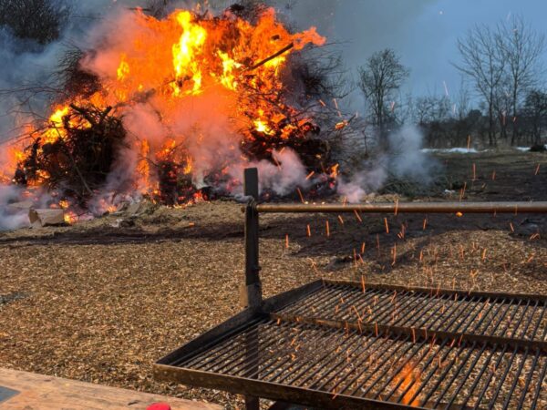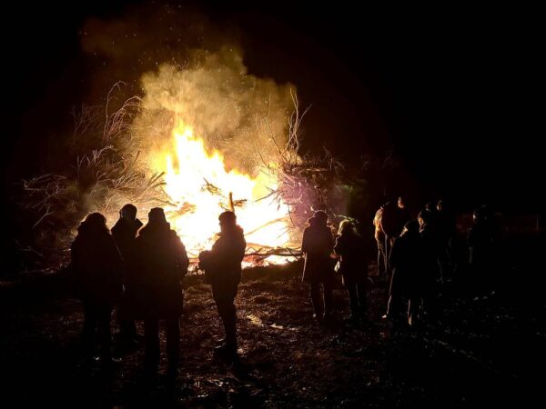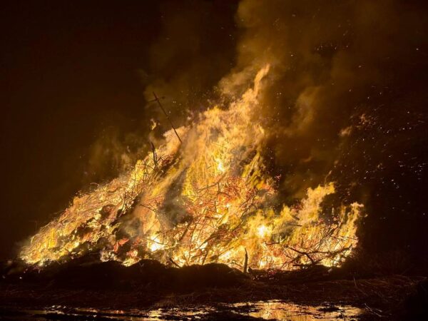 Gerade in diesem Moment legte der Trecker noch einmal nach und schob frisches Material auf den Haufen – die Flammen loderten erneut auf und tauchten die Gesichter rundherum in warmes Licht.