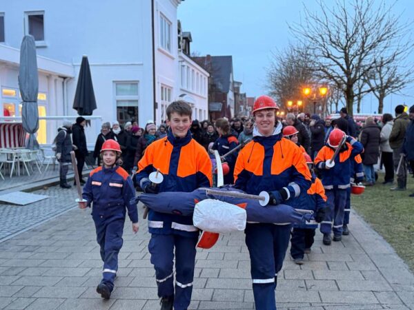 Pünktlich um 17:45 Uhr setzte sich dann der Fackelumzug in Bewegung. Gemeinsam mit dem „Peter“ und der Wyker Feuerwehr ging es Richtung Fehrstieg zur Biike. Angeführt von Jugendfeuerwehrwart Jannic Salzmann marschierte die Jugendfeuerwehr Wyk zahlreich mit. Gegen 18:30 Uhr wurde das Feuer entzündet. Wehrführer Jörg Carstensen sagte augenzwinkernd ins Mikrofon: „Ich habe heute den kleinsten Part – den Rest erledigen alles die Jungs.“